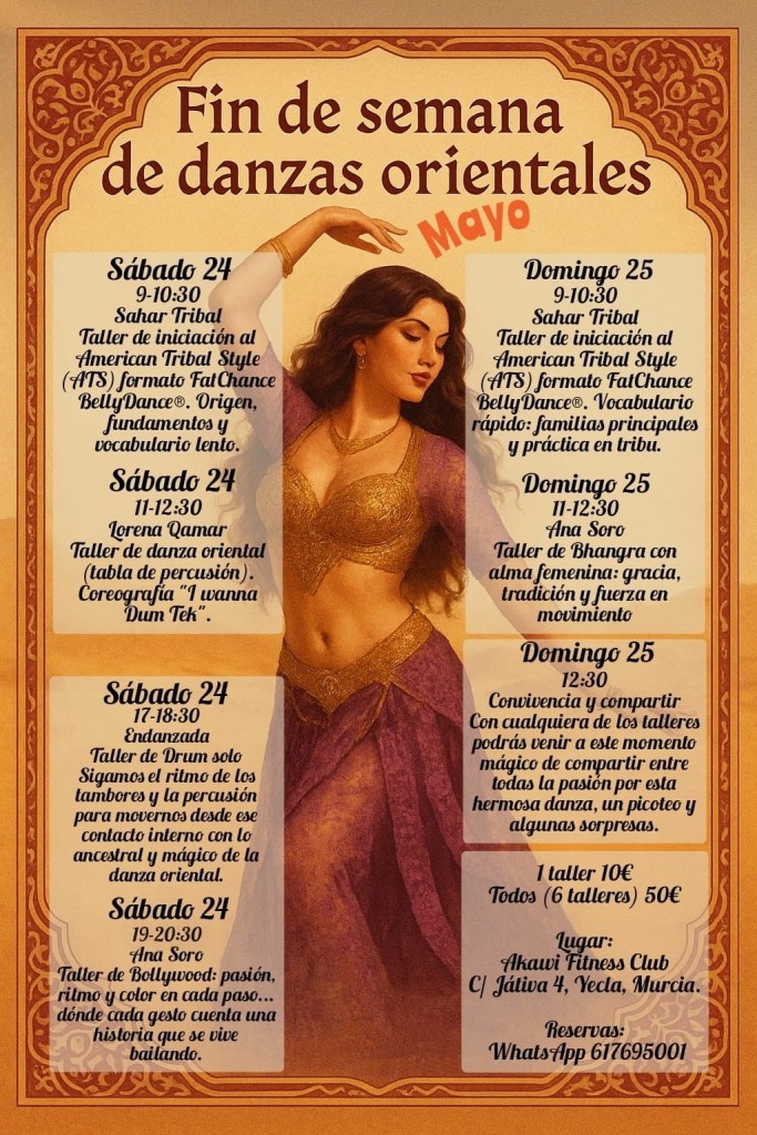 El 24 y 25 de mayo tenemos una cita muy especial en nuestra escuela: un fin de semana dedicado por completo a las danzas orientales, con talleres únicos para aprender, disfrutar y compartir esta pasión en un ambiente cercano y enriquecedor.
